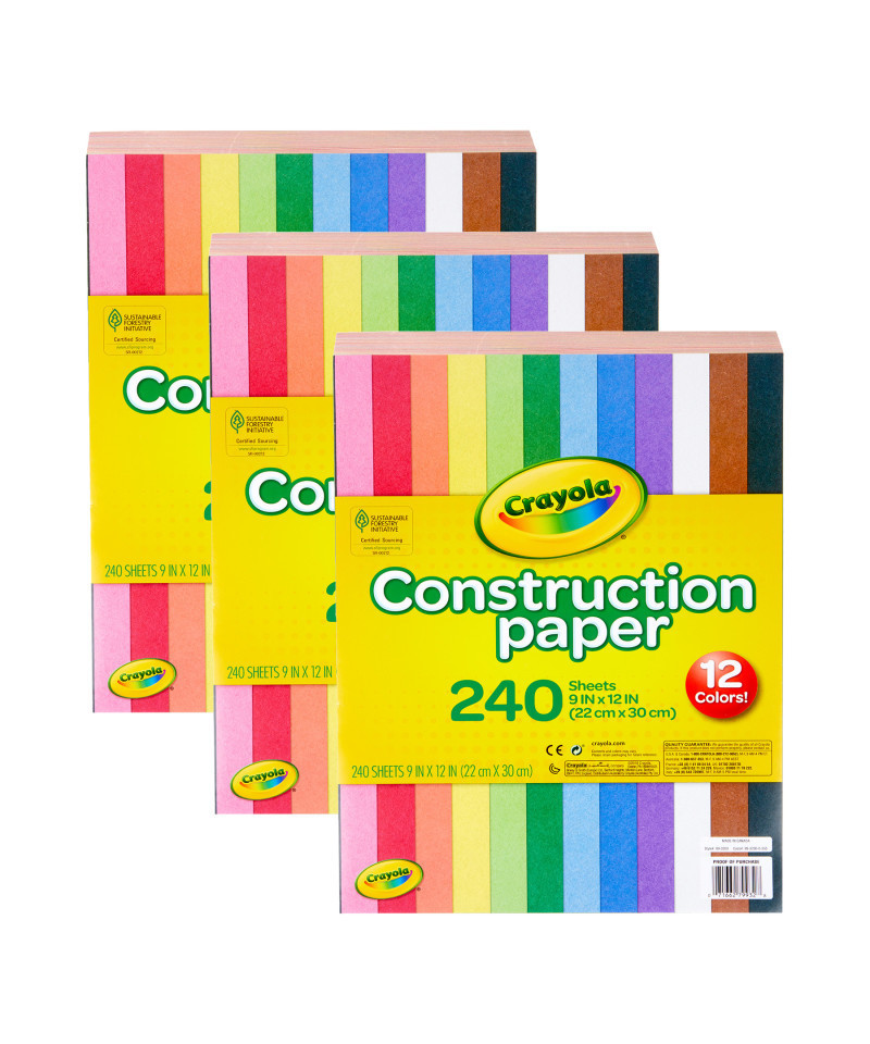 Crayola Construction Paper is a must-have for home and school projects. Each pack includes 240 sheets of construction paper in standard 9x12 paper size. There are 12 different colors including: Pink, Red, Orange, Yellow, Light Green, Green, Light Blue, Blue, Violet, White, Brown and Black. Sold as 3 packs for a total of 720 sheets.