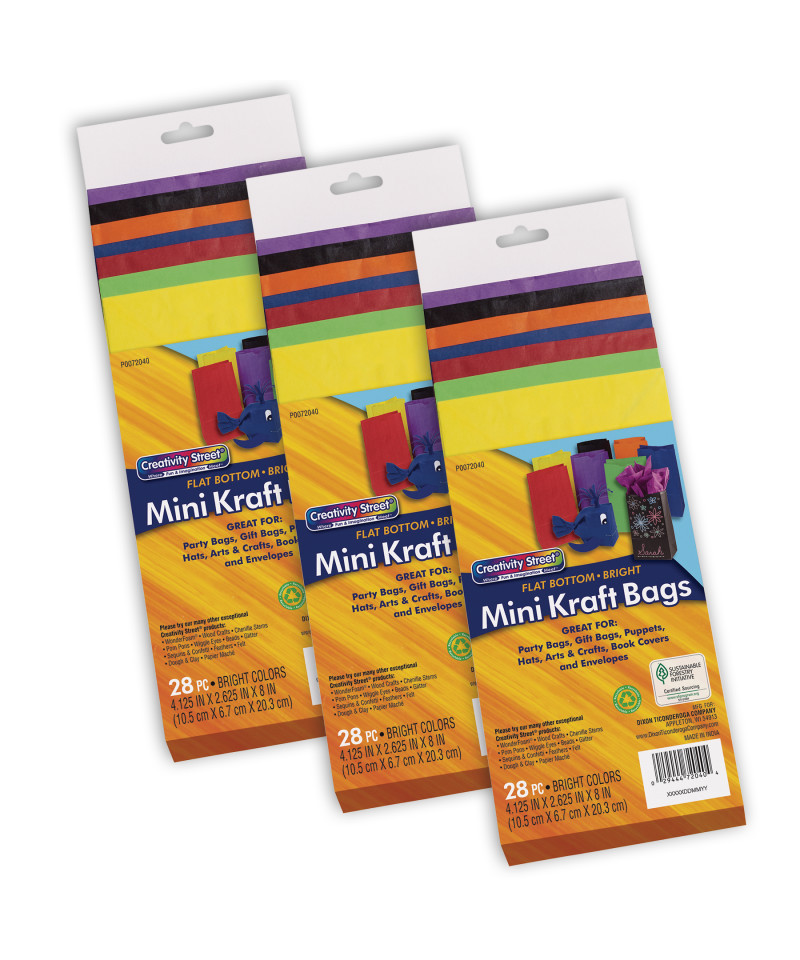 Perfect for many arts and crafts projects like making puppets, masks, party bags, hats and gift bags. Our bags are made from high quality, brightly colored uncoated kraft paper that accepts all types of media like crayons, pens, paints and rubber stamps. Recyclable. Measures 4" x 2-5/8" x 11". Each pack includes 28 bags in assorted bright colors. Sold as 3 packs for a total of 84 bags.