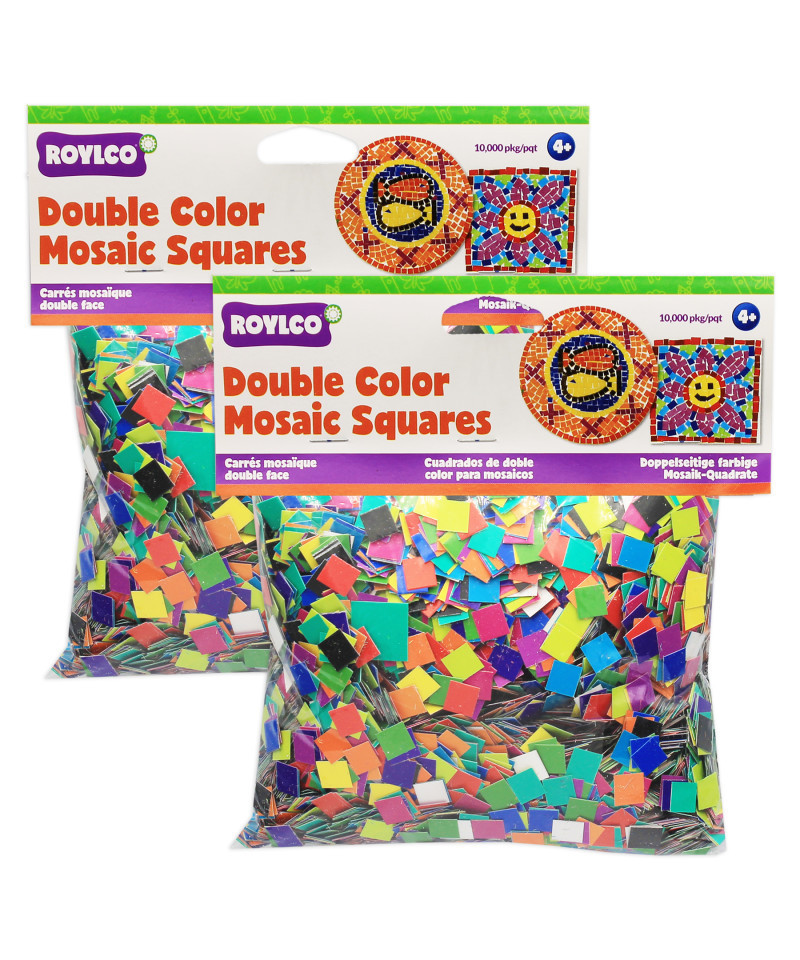Use Double Color Mosaic Squares to create patterns, decorate boxes and make fabulous frames. Bright colors on both sides of heavy card. Great for all types of arts and crafts projects. Includes guide with craft ideas. Squares measure 3/8" (1 cm). Includes 10,000 per package. For ages 4 and up. Sold as 2 packs for a total of 20,000 mosaic squares.