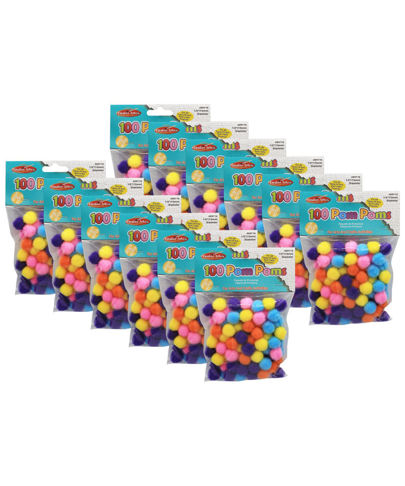 Furry balls of fluff add life to your craft creations. Soft and Crush resistant Pom Poms are great for making dolls, ornaments or wherever your creativity takes you. Each pack includes 100 pom poms. Sold as 12 packs for a total of 1200 pom poms.