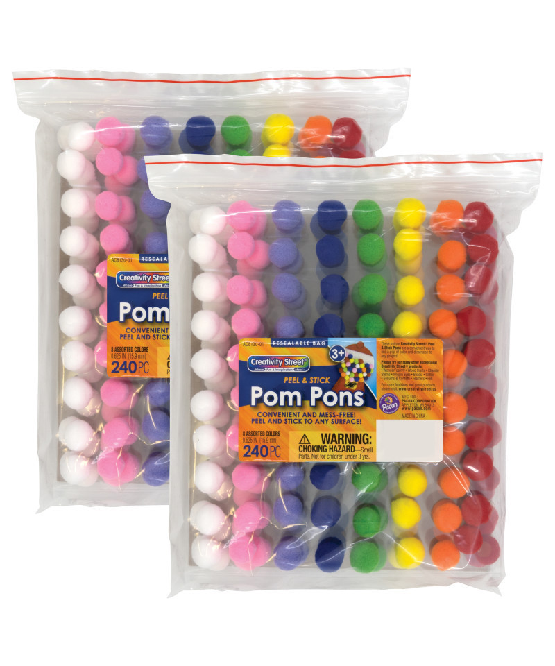 Add texture, dimension and color to any project! Our high quality Creativity Street® Pom Pons are plush and round and come in a variety of vibrant colors. Our unique peel-n-stick poms have 8 assorted colors, including White, Pink, Purple, Blue, Yellow, Orange, Green and Red. No glue, no mess - just peel and stick to any surface! Each pack includes 240 pieces: 3 sheets of 80 poms, including 10 each of the 8 colors per sheet. Sold as 2 packs for a total of 480 pieces.