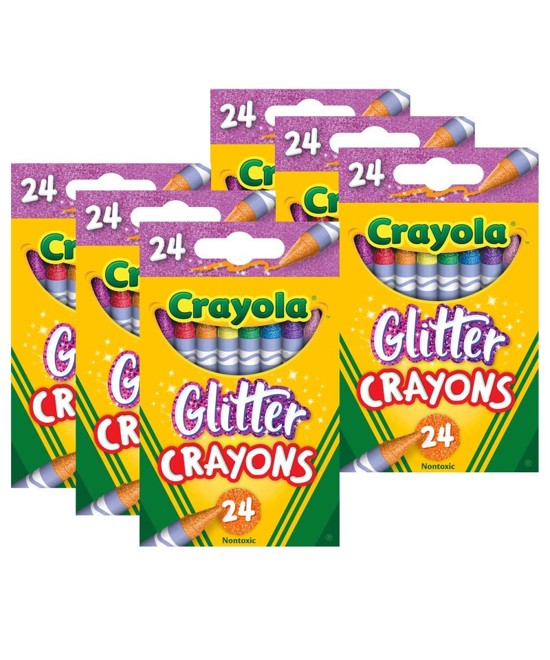 Colorful and sparkly—Crayola glitter crayons let kids add dazzle to their designs and coloring art projects with glitter infused with the crayon wax. No-mess creative glitter play! Each pack includes 24 crayons in a reusable tuck box. Sold as 6 packs for a total of 144 crayons.