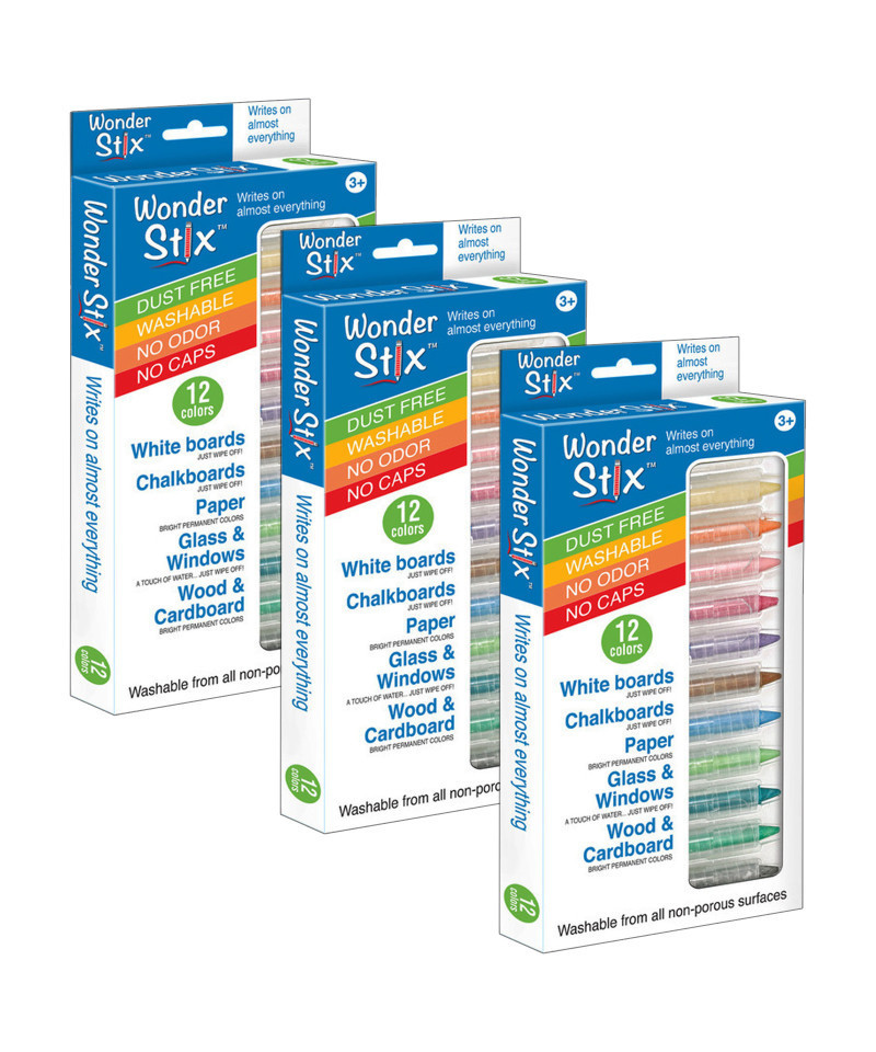 The Wonder Stix can just about write on any surface such as chalkboards, mirror, and wood and paper. It's easily washable from non-porous surfaces. Your imagination can run wild all over the house! Each box includes 12 bright colors. Sold as 3 packs, 36 pieces total.