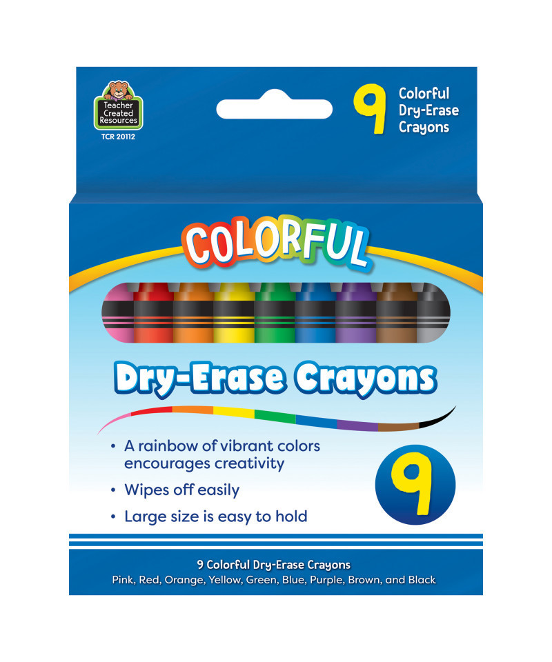 Write, color, create – and easily erase! Great for use on Teacher Created Resources Learning Mats, Teacher Created Resources write-on/wipe-off books and charts, and other dry-erase surfaces. Wipes off easily from dry-erase surfaces! Large size (3-7/8" long & 3/8" in diameter) is easy to hold. Includes 9 colorful dry-erase crayons in pink, red, orange, yellow, green, blue, purple, brown, and black. Non-toxic and conforms to ASTM D-4236. Ages 3+