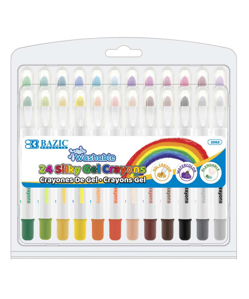 Silky gel crayons feature eye-catching brilliant colors, a buttery texture, and superior blending that helps you create works of art with ease. Little artists can learn the basics of drawing, coloring, and blending because they are ideal for beginners. They're great on textures, dark surfaces, glass, mirrors, paper, and posters. Draw on top of colored pencil, wax crayon, watercolor crayon, and gel pen. Twenty-four washable crayons are stored in a sturdy plastic storage case with individual spots to hold each crayon, so you can always keep them neatly organized and on the go. Non-toxic, acid-free, conforms to ASTM D-4236.