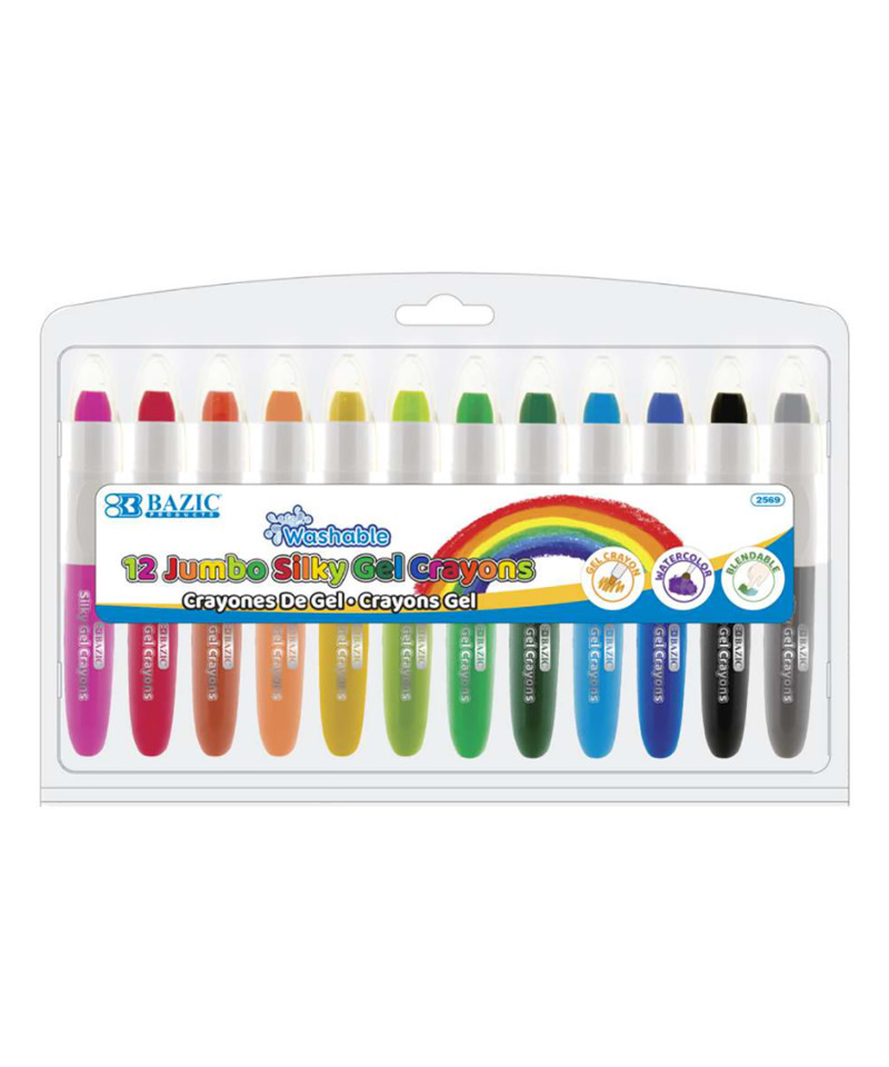 Jumbo silky gel crayons feature eye-catching brilliant colors, a buttery texture, and superior blending that helps you create works of art with ease. Little artists can learn the basics of drawing, coloring, and blending because they are ideal for beginners. They're great on textures, dark surfaces, glass, mirrors, paper, and posters. Draw on top of colored pencil, wax crayon, watercolor crayon, and gel pen. Twelve jumbo washable crayons are stored in a sturdy plastic storage case with individual spots to hold each crayon, so you can always keep them neatly organized and on the go. Non-toxic, acid-free, conforms to ASTM D-4236.