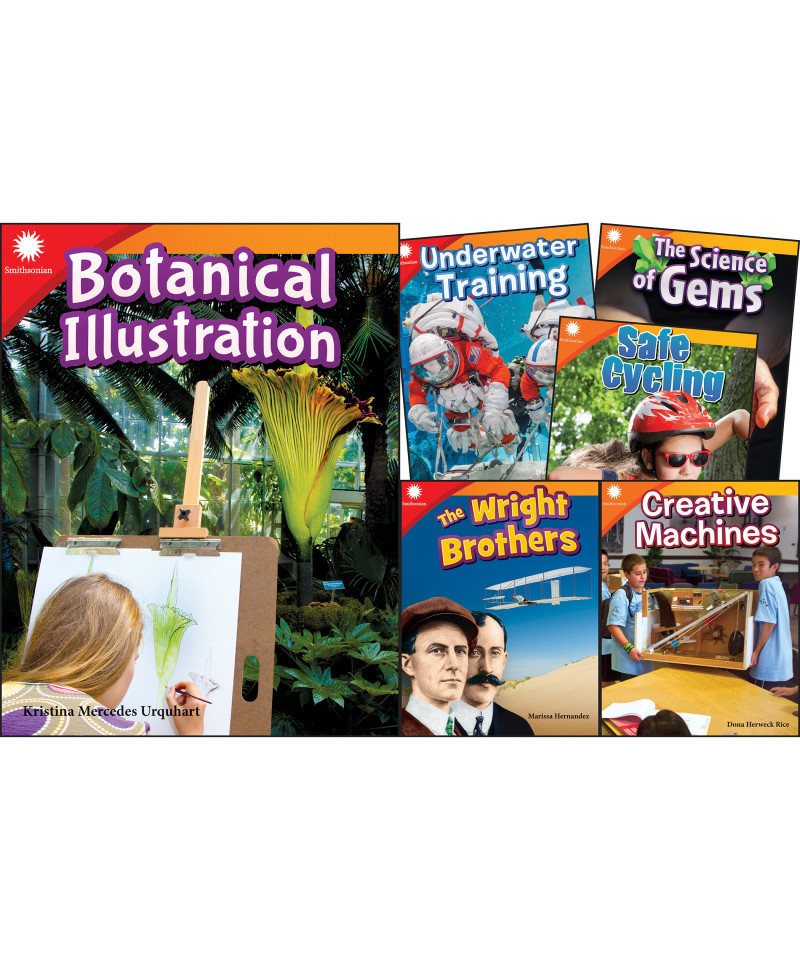 What job pays people to draw--and helps science? Why do astronauts train in water before going to space? Find the answers to these questions and more with this STEAM book set! Created in collaboration with the Smithsonian Institution, this set features hands-on STEAM challenges that are perfect for makerspaces and that guide students step-by-step through the engineering design process. Make STEAM career connections with career advice from actual Smithsonian employees working in STEAM fields. Take a virtual tour of the Smithsonian with these titles: Botanical Illustration, Creative Machines, Gem Hunters, Safe Cycling, The Wright Brothers, Underwater Training.