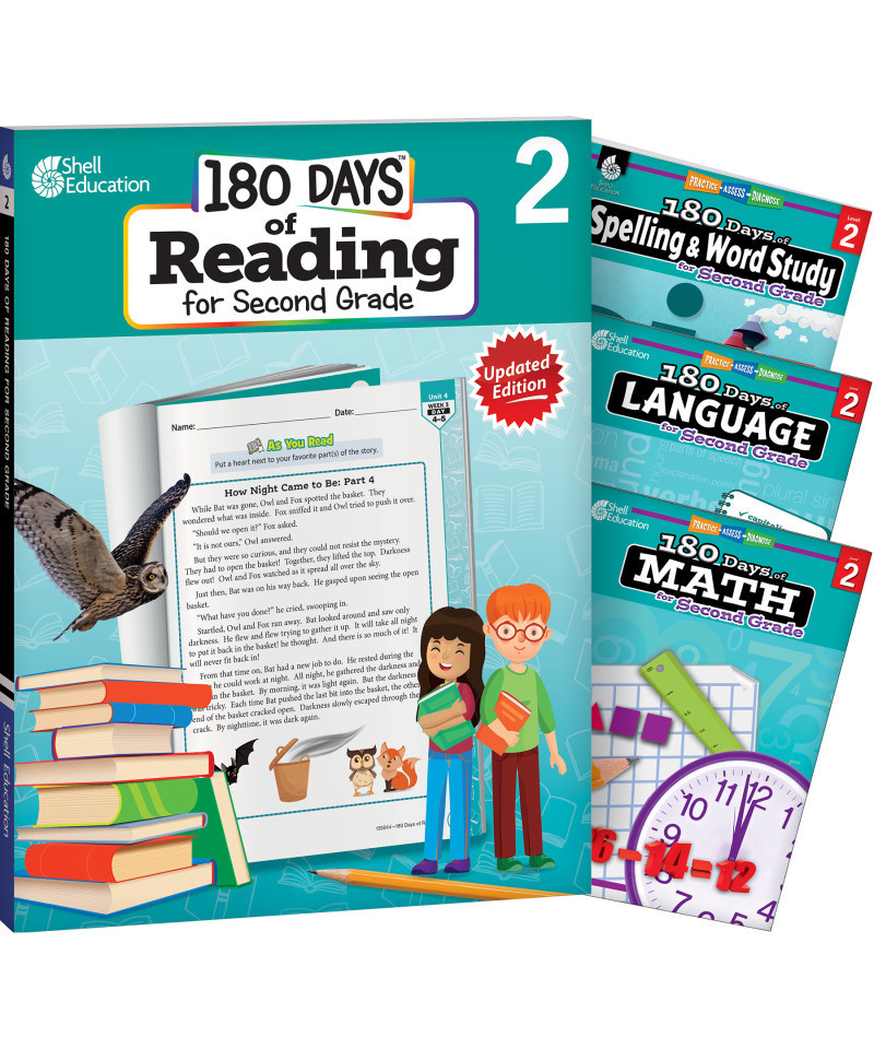 • This set includes 4 grade-specific 180 Days books: Reading, Spelling, Language, and Math.