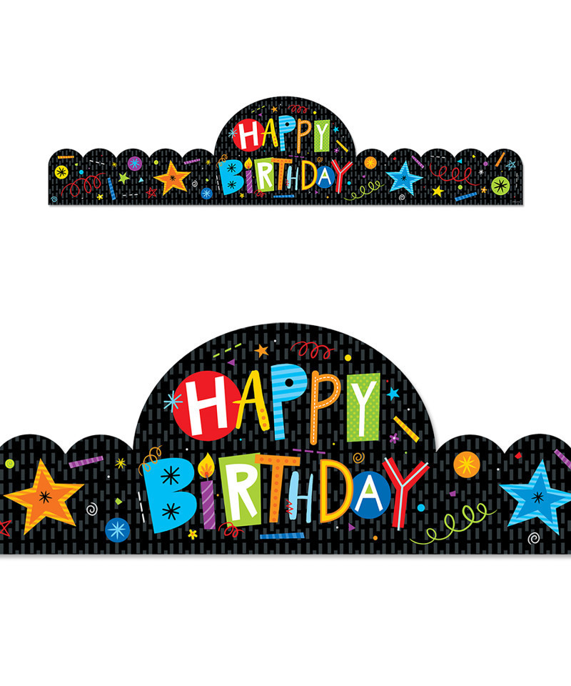 This festive Happy Birthday crown features colorful letters, stars, and multicolored confetti on a bold black background. Children will love wearing this celebratory crown on their special day. Perfect for use in any classroom, church, daycare, camp, or school setting! Crowns are adjustable. Crowns measure 24" x 6-1/2". Each pack includes 30 crowns.