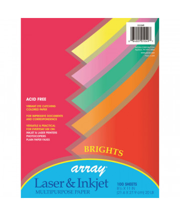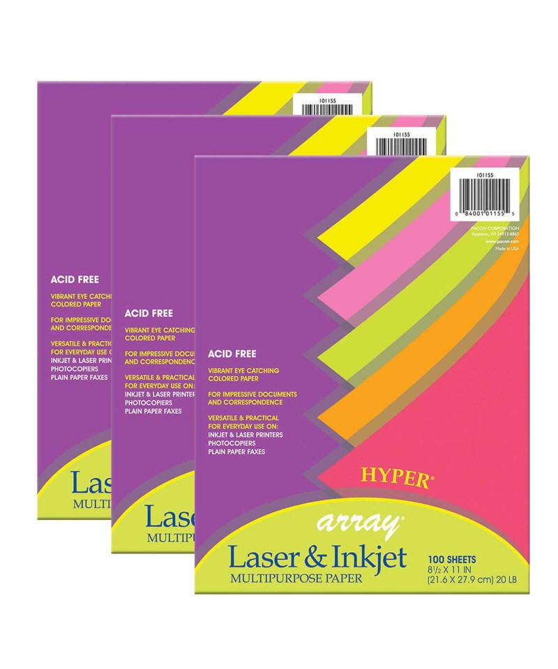 Vibrant colored paper perfect for documents you want to stand out among others. This 20 lb. paper works well in laser and inkjet printers, photocopiers and offset printers. Assorted five colors include: Hyper Yellow, Hyper Pink, Hyper Orange, Hyper Coral Red and Hyper Lime. Acid-free and recyclable. Each pack includes 100 sheets. Each sheet measures 8.5" x 11". Sold as 3 packs for a total of 300 sheets.