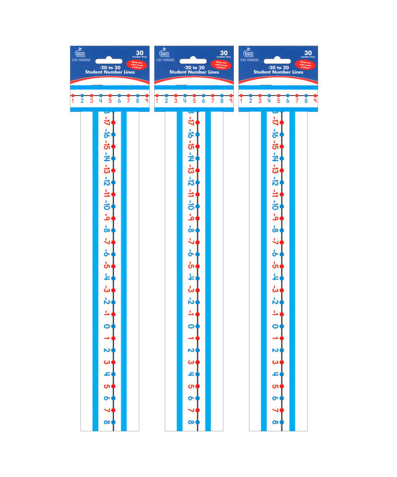The -20 to 20 Student Number Lines are color coded to make it easy for students to recognize odd and even numbers. Each set of student number lines includes 30 number lines that measure 22" x 1.5" each. They also feature a write-on/wipe-away surface to make it easy for students to use over and over again! Student number lines are the perfect hands-on tool for reinforcing mathematical concepts such as counting, identifying number patterns, partitioning numbers, comparing numbers, and building number sense. Sold as 3 packs for a total of 90 number lines.