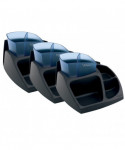 Compact format for optimized storage. Features 6 storage compartments: 2 for small objects, 2 for pens and other tall items, 1 for note pads and 1 for paper in the rear of the organizer. Made of 55 percent recycled plastic. Black base with blue pencil cup accent. Sold as a pack of 3 organizers.