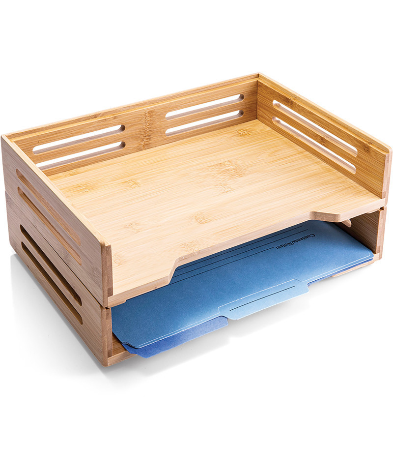 Bamboo Letter Tray is stackable to maximize storage space. Made from highly renewable, biodegradable, and carbon-negative bamboo. Pack of 2 trays. Sturdy enough to hold heavy files, notebooks, files, and more. Can stack and combine with others. Dimensions: 10.47"L x 14.09"W x 4.45"H.