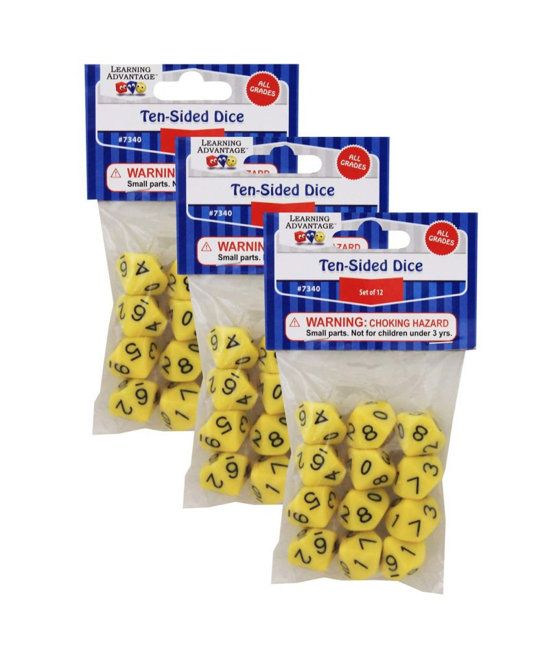 Dice can be used to explore problem solving such as number concepts, operations, probability, statistics, pre-algebra and more. Probability and math activities come alive when using these colorful, specially configured, alternative dice. Colors may vary. Each pack includes twelve 10-Sided Polyhedral Units Dice. Sold as 3 packs for a total of 36 dice.