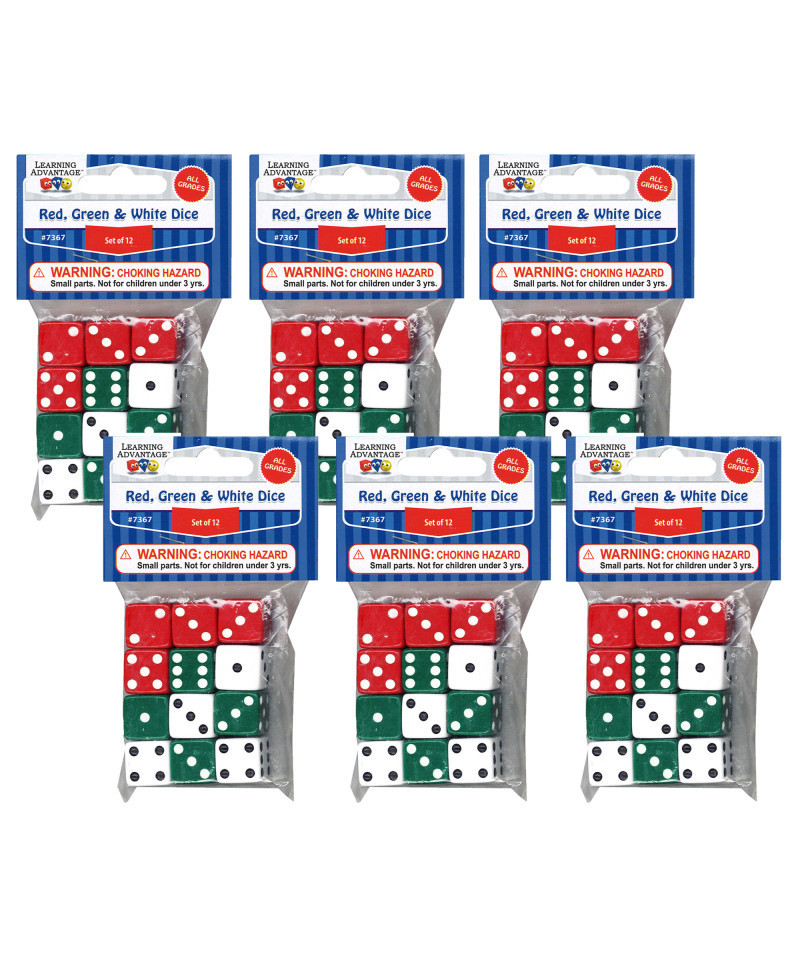One of the most versatile manipulatives, these 5/8" dice can be used to explore problem solving such as number concepts, operations, probability, statistics, pre-algebra and more. Each pack contains 12 dice. Sold as 6 packs for a total of 72 dice.