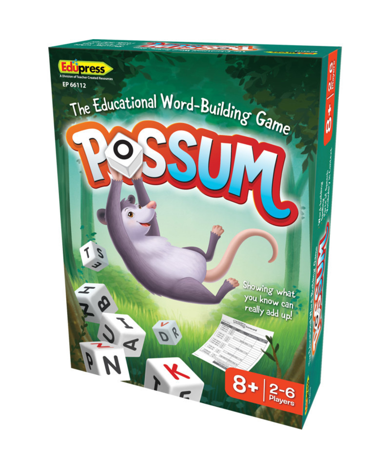 POSSUM is a dice game in which players use six dice to spell out words and earn points by filling categories on their scorecards. The categories are arranged by parts of speech. Players have to make nouns, verbs, and adjectives. They also try to make 5- and 6-letter words of any part of speech. Players get extra points for using less common letters in their words. In addition, players can have fun by making up one word—a POSSUM word—as long as they can use it in a sentence and name its part of speech in that sentence. Points are recorded on a scorecard, and the player with the most points at the end of the game is the winner. Includes an instruction sheet, 6 letter dice, and 100 scorecards. For 2-6 players.