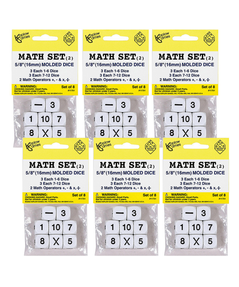 Koplow Games Math Dice Set is a fun, hands-on way for students to learn basic math skills. Children learn more effectively when it is reinforced through play. Perfect for individual play, in small groups or as a classroom making these dice a great educational resource. Dice measure 16mm (5/8"). Each set includes 8 dice: 3 each of 1-6 dice, 3 each of 7-12 dice and 2 math operator dice. Sold as 6 sets, 48 dice total.