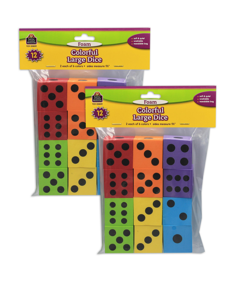 Learn about place value, math operations, and probability. Soft foam dice are quiet and durable. Cubes measure 1-1/2". Each pack includes 12 dice: 2 each of 6 colors. Sold as 2 packs for a total of 24 dice.
