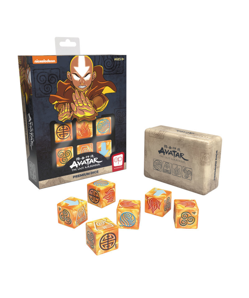 - Collectible Avatar The Last Airbender 6-sided dice set featuring element symbols Water, Earth, Air, Fire - including collectible tin carrying case