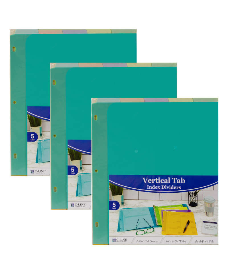 Vertical storage solutions are trending and these index dividers are the latest to follow the movement. The 5-Tab Index Dividers feature a write-on tab on top of the dividers, which works with pencil, ball point pen or permanent marker. The tabs gradually increase in size with each poly divider, making it possible to create more detailed descriptions or stagger the labels to make them easier to read. Not only can the tabs be used to identify the sections inside the binder, but color can be an easy visual way to categorize information. The brightly colored dividers are three-hole punched and open on two sides to reveal a storage pocket for 8-1/2 x 11 size documents. Load pages from the top or the binding edge to ensure the documents remain in place while stored inside 3-ring binders. Bright color assortment includes green, orange, purple, turquoise and yellow. Each set includes 5 dividers. Sold as 3 sets for a total of 15 dividers.