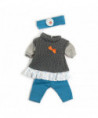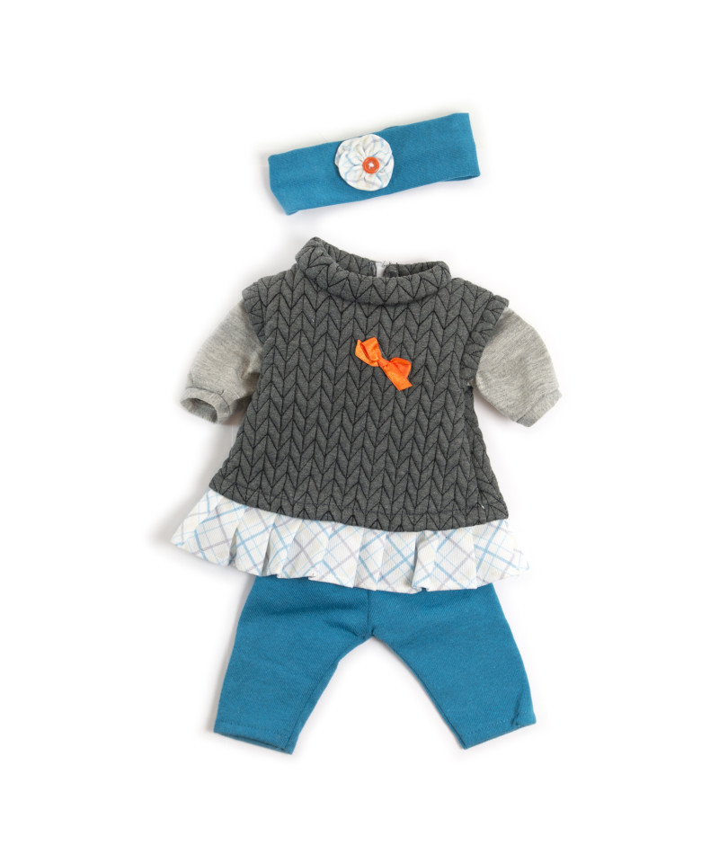 Mild weather gray pant and sweater set with headband for dolls sized 15"-15 3/4". Includes headband, sweater and pants. Used to teach children how to dress for climate common in fall and spring seasons. Designed to help children meet their needs of self-awareness and personal autonomy.