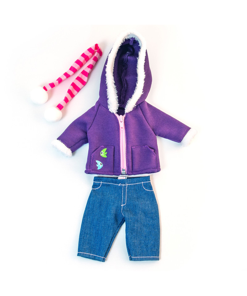 Cold weather purple fleece to dress your doll for cold weather. Tool for teaching children about autonomy and learning how to dress themselves by practicing dressing a doll. Also great to teaching children how to dress for different types of weather.