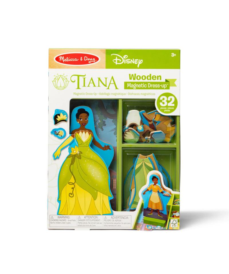 - Dress the Melissa & Doug wooden magnetic figure Disney Princess Tiana from Disney’s The Princess and the Frog in different magnetic outfits to mix and match