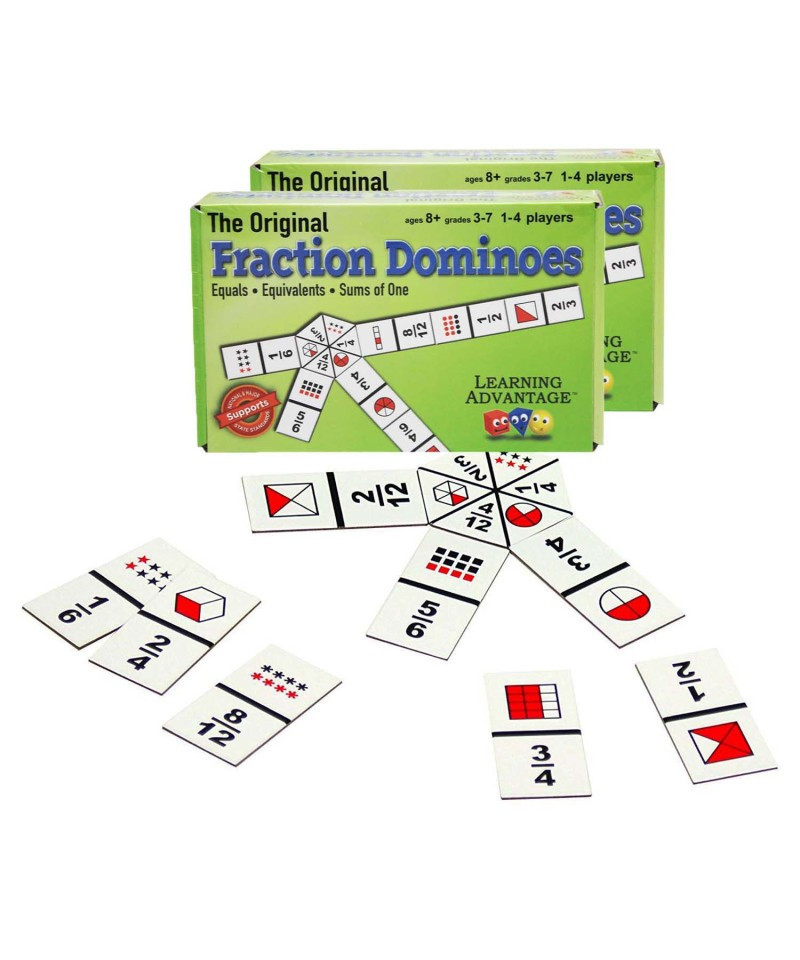 Enliven the day with Fraction Dominoes! This popular game is now enriched with new content to make it even more powerful! Six group and solitaire games offer experience in recognizing fractional parts, matching equivalent fractions, and building sums of one. The 49 dominoes and hexagonal starting board include both pictures and fractional numbers with denominators ranging from 2 to 12. Fractions are shown as parts of wholes or parts of sets. For 1-4 players. Sold as a pack of 2 complete games.
