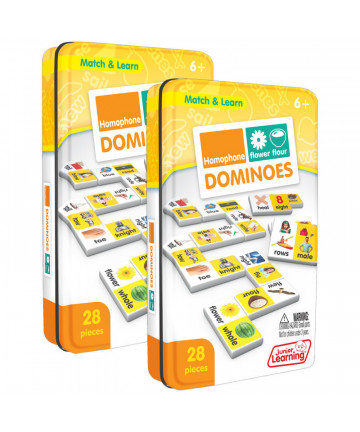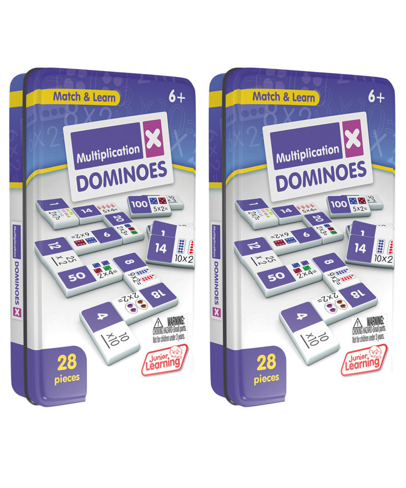 Multiplication dominoes include a 28 piece set on thick plastic dominoes. Dominoes come in a collectors tin for storage. Children will love the feel of real dominoes as they complete the numeracy matching game. Sold as 2 sets.