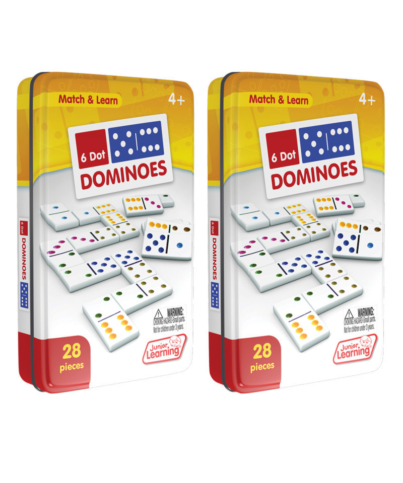 Six dot dominoes include a 28 piece set on thick plastic dominoes. Dominoes come in a collectors tin for storage. Children will love the feel of the dominoes as they complete the matching game. Sold as 2 sets.