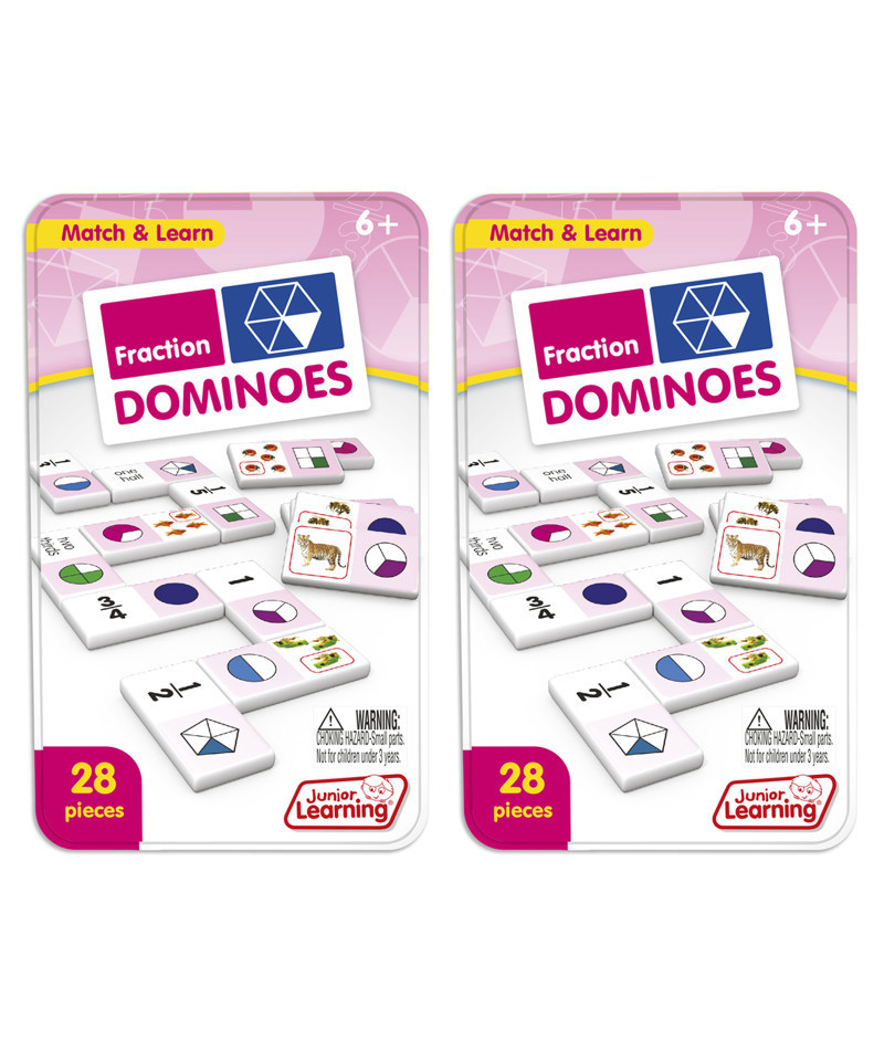 Fraction dominoes include a 28 piece set on thick plastic dominoes. Dominoes come in a collectors tin for storage. Children will love the feel of real dominoes as they complete the fraction matching game. Sold as 2 sets.