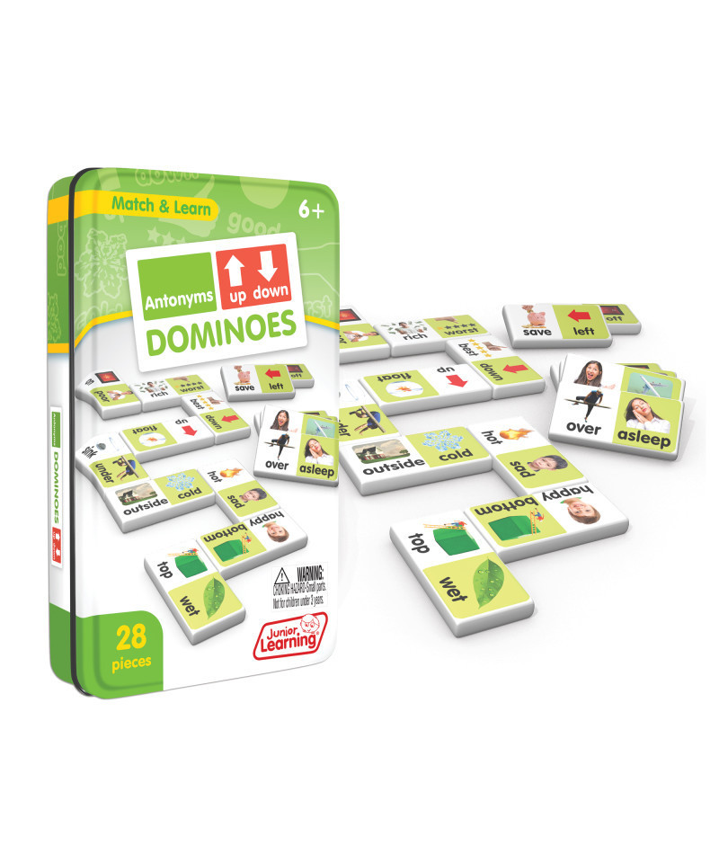 Antonym dominoes include a 28 piece set on thick plastic dominoes. Dominoes come in a collectors tin for storage. Children will love the feel of real dominoes as they complete the antonym matching game.