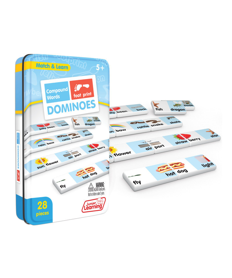 Compound Word dominoes include a 28 piece set on thick plastic dominoes. Dominoes come in a collectors tin for storage. Children will love the feel of real dominoes as they complete the compound word matching game.