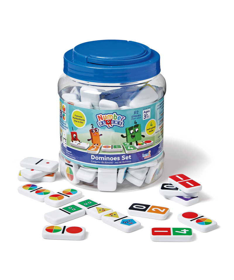 - KIDS LEARNING TOYS 3-5: This set includes 112 Numberblocks Dominoes (28 each of 4 different styles) and an Activity Guide with 4 easy-to-learn games. Dominoes come in a reusable storage bucket with a handle for easy storage.