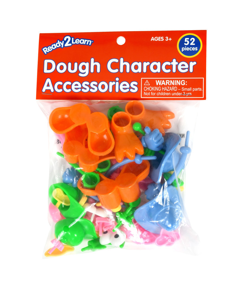 Bring your dough creations to life! This set comes with 52 body parts and accessories in 21 different shapes. They’re versatile and feature arms, feet, eyes and much more for decorating all kinds of objects. Put them on desserts, fruits, vegetables, crafts, sculptures and more. Children can add personality and create narratives as they make new characters. Dough characters help children explore emotions, role play, communication and social-emotional learning. Children love to create whacky characters and act out stories. Develop imagination, creative expression, hand-eye coordination and fine motor skills as children insert different accessories into dough. These accessories are made of durable plastic, so children can use them repeatedly. The accessories quickly come clean with soap and warm water. Includes 2 types of hands, 3 types of eyes, 2 types of feet, 3 types of mouth, 2 types of nose, 2 types of ears, eyebrows, a mustache, 2 hats and 3 miscellaneous appendages. || For ages 3+. Size of pointy feet: 2.7"L. Size of eyebrow: 1.7"L. Dough not included. Colors may vary.