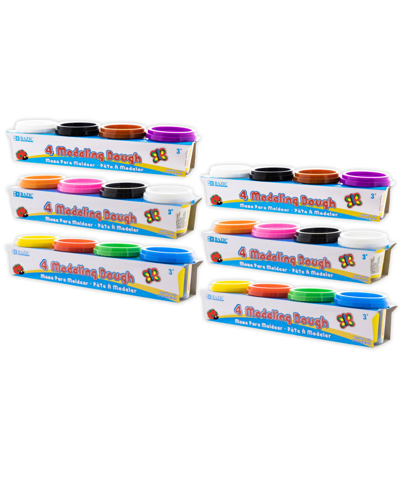 Our modeling dough features a soft and pliable texture, providing a smooth and enjoyable molding experience. Designed to cater to users of all skill levels, it requires minimal effort to manipulate. Not only is shaping and molding a breeze, but the dough's formula also ensures a hassle-free clean-up experience so creators can focus on their artistic vision without worrying about a mess afterward. Crafted from non-toxic materials, our modeling dough prioritizes safety. Proper testing and adherence to safety standards ensure a product that is both enjoyable and safe. To preserve the dough's optimal texture, our product comes with a practical storage solution. Store it in its container to prevent drying, keeping the dough soft and ready for use. Tailored to ignite imagination and foster creative expression, our modeling dough allows individuals to explore their artistic potential without constraints. Each pack includes 4 tubs of modeling dough, each 4 oz. each. Each pack includes one of three assortments (no color choice): blue, green, red & yellow; white, black, deep orange, & purple; or white, black, pink & orange. Sold as 6 packs for a total of 24 tubs of dough.