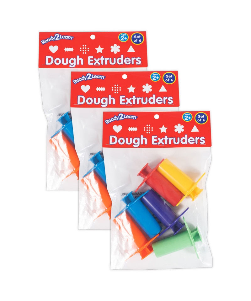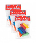 This set includes 6 dough extruders with different patterns: triangle, heart, flower, star, spaghetti and zig-zag. Press the dough through the tools to create different patterns and textures. The chunky plastic handles provide greater control and accuracy as children create. The 2.75" plungers are thick and easy for small hands to manipulate. Children can use these art tools to create dough scenes and decorate their creations. With 6 different ends and a chunky grip, these art tools foster independence and inspire creative expression. The handles also keep the tools in place when not in use, which means they won't roll away! Made of durable plastic, these art tools will last for endless creating. When it's time to clean up, simply wash the tools with soap and warm water. For ages 2+. Size of closed extruder: 3"L x 2.7"W. Size of opened extruder: 5.6"L. Sold as 3 sets.