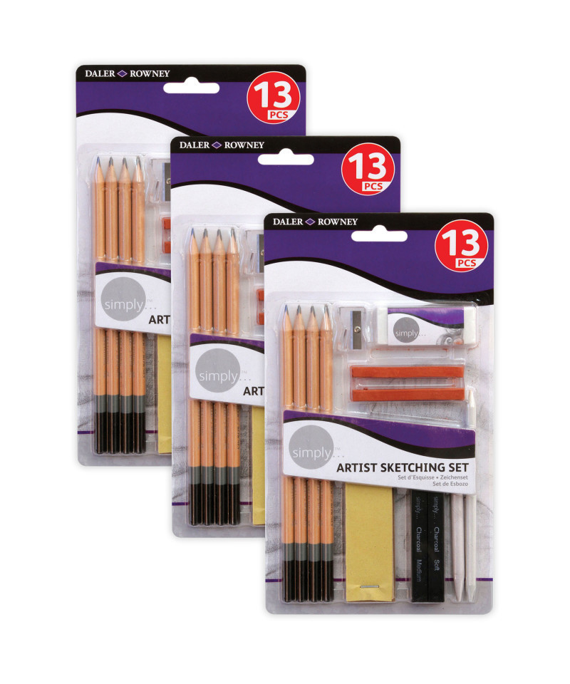 - EVERYTHING YOU NEED TO GET STARTED—Sold as 3 complete sets for a total of 39 pieces, each individual set includes 4 Sketching Pencils, 2 Pastel Sticks, 2 Charcoal Sticks, 2 Paper Blenders, Eraser, Sharpener, Sandpaper