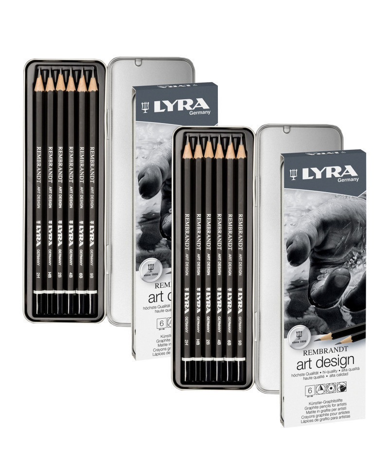 Introducing Lyra Rembrandt Art Design graphite pencils—Experience the unparalleled precision and richness of our pure graphite pencils, meticulously crafted for architects and artists. With expertly milled graphite that ensures a smooth, defined stroke, these pencils offer an array of 17 gradations, from deep, intense blacks to subtle, delicate greys. The luxurious softness of the gradations enhances the natural brilliance of the graphite, while the compact cores deliver impeccable, sharp points for flawless detail and definition in every stroke. Having spent over 200 years providing quality products to artists, schools & offices all over the world, the historic LYRA brand — founded by Johann Froescheis in Nuremberg in 1806 — is one of the oldest pencil companies in the world. Synonymous with innovation & quintessential German quality, Lyra is a well-respected name all over the world. Ever since it produced its first pencils, Lyra has stuck to strict rules to ensure the utmost quality — from the selection of raw materials right through to the manufacturing process. Each set includes 9B, 6B, 4B, 2B, HB, 2H. Sold as 2 sets for a total of 12 pencils, 2 metal tins.