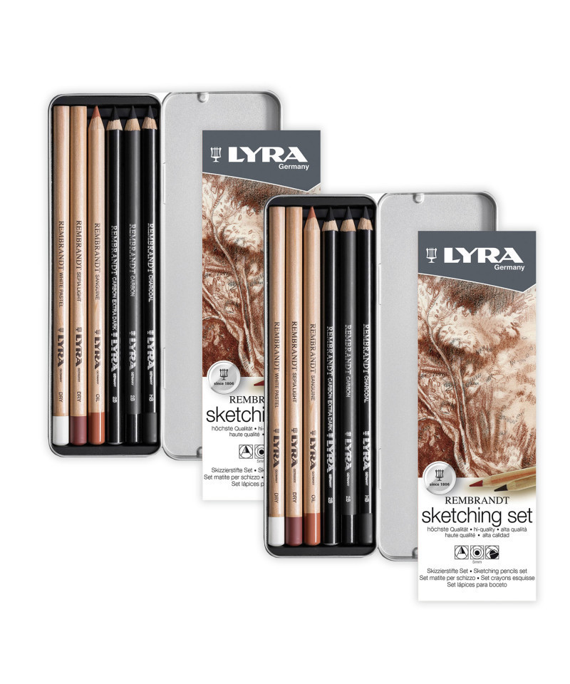 Introducing Lyra Rembrandt Monochrome professional graphite, charcoal, and natural tone pencils. Ideal for both sketching the foundations of a masterpiece and creating polished portraits and landscapes, this range is a must-have for discerning artists. The collection includes Sanguine, Sepia, and Pastel pencils available in both Dry and Oil varieties, expanding your creative possibilities. The Dry pencils are expertly balanced with pigment and binder, allowing for effortless blending and erasing, while the Oil pencils provide a rich, pasty stroke for bold, defined contrasts. With 5mm diameter leads packed with highly concentrated pigments, these pencils deliver deep, intense tones that make your artwork stand out. Having spent over 200 years providing quality products to artists, schools & offices all over the world, the historic LYRA brand — founded by Johann Froescheis in Nuremberg in 1806 — is one of the oldest pencil companies in the world. Synonymous with innovation & quintessential German quality, Lyra is a well-respected name all over the world. Ever since it produced its first pencils, Lyra has stuck to strict rules to ensure the utmost quality — from the selection of raw materials right through to the manufacturing process. Each set includes Carbon Pencil 2B, Charcoal Pencil Hb, Carbon Extra Dark Pencil 2B, Sanguine Oil Pencil, Sepia Light Dry Pencil, White Pastel Dry Pencil. Sold as 2 sets for a total of 12 pencils, 2 metal tins.