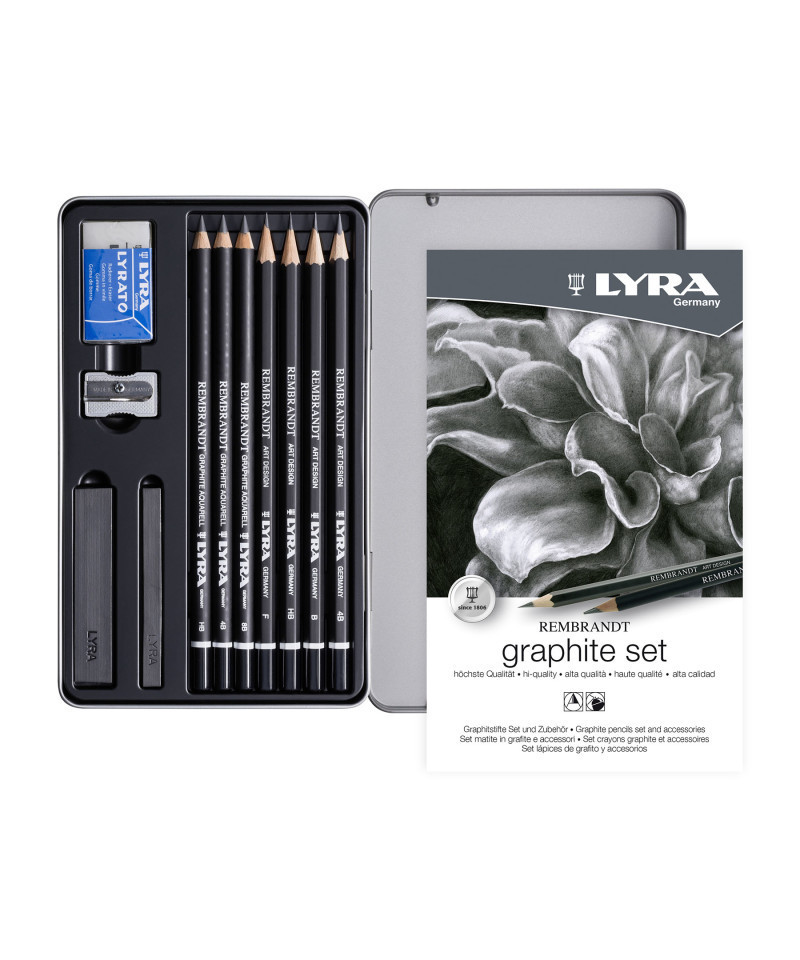 - 11 PIECE GRAPHITE PENCIL SET—Includes Art Design Pencils (HB, F, B, 4B), Aquarell Watercolor Pencils (HB, 4B, 8B), Graphite Sticks (4B, 6B), Lyrato Eraser and Sharpener
