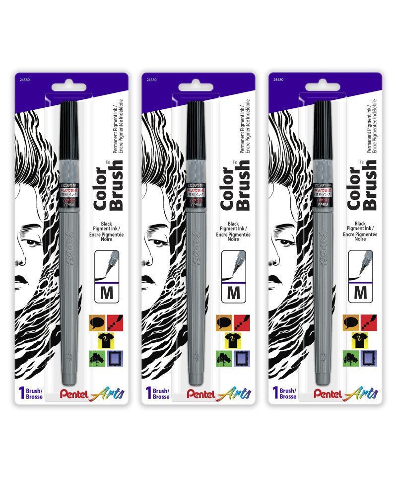 Pentel Arts Color Brush with Pigment Ink, Medium Tip, Black, Pack of 3