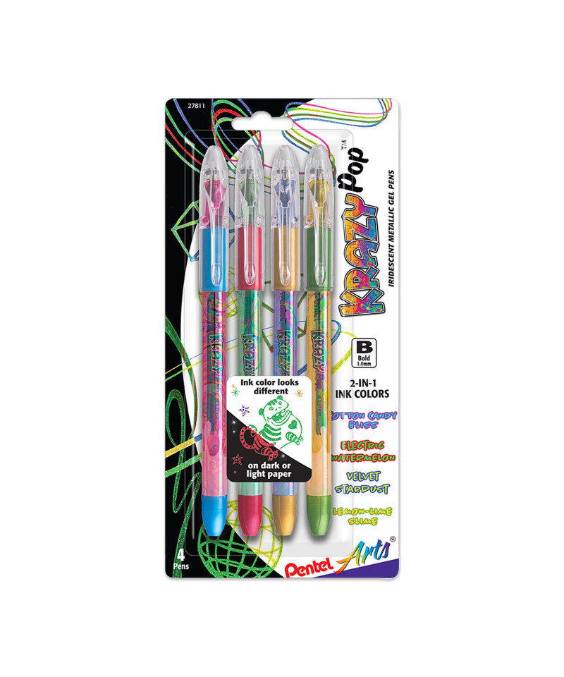 The Pentel Krazy Pop gel pens add a "Pop" outrageous color to your writing world. New glittery iridescent ink adds a dazzling, dual-color sparkle effect on light or dark colored paper to make your writing and artwork stand out. Smooth gel ink and extra-long balanced barrel for effortless writing and control. Latex-free grip for comfortable writing and drawing. 1.0mm tip writes bold lines. Each pack includes 4 pens in assorted colors.