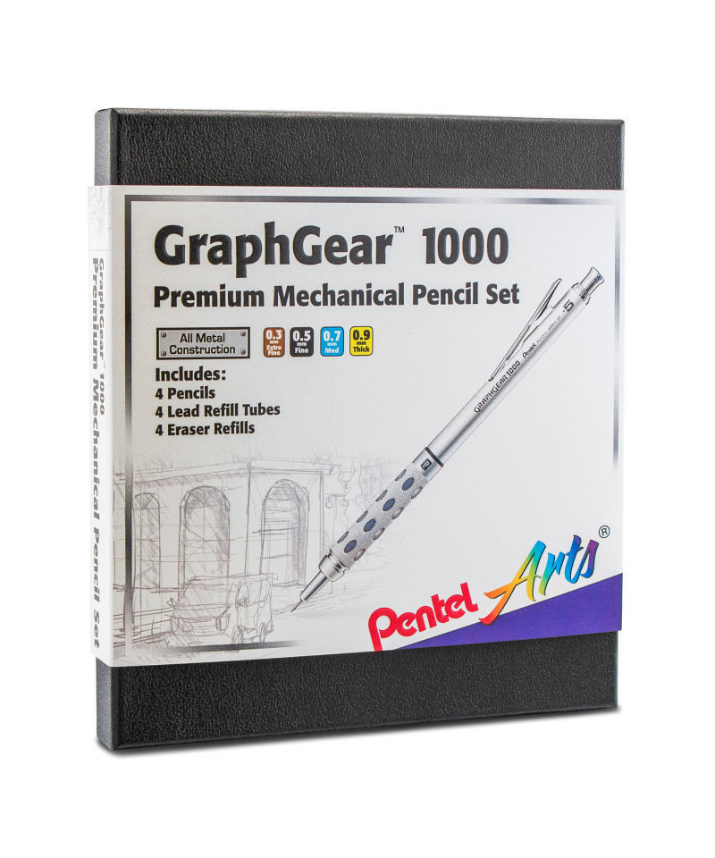 The Pentel GraphGear 1000 mechanical pencil is a superior drafting pencil for architects, draftsmen, artists and enthusiasts. The 4mm tip design makes it ideal for use with rulers and templates. A unique, dual-action retractor advances and retracts the pencil tip to protect lead from breaking. The built-in lead hardness indicator allows you to easily identify your lead type. It comes pre-loaded with super Hi-Polymer HB lead, which never needs sharpening and produces a clear dark line. The finely chiseled metallic grip inlaid with soft, latex-free pads makes extended writing and drawing comfortable. Set includes 4 pencils in 0.3mm, 0.5mm, 0.7mm and 0.9mm, along with refill leads and erasers.