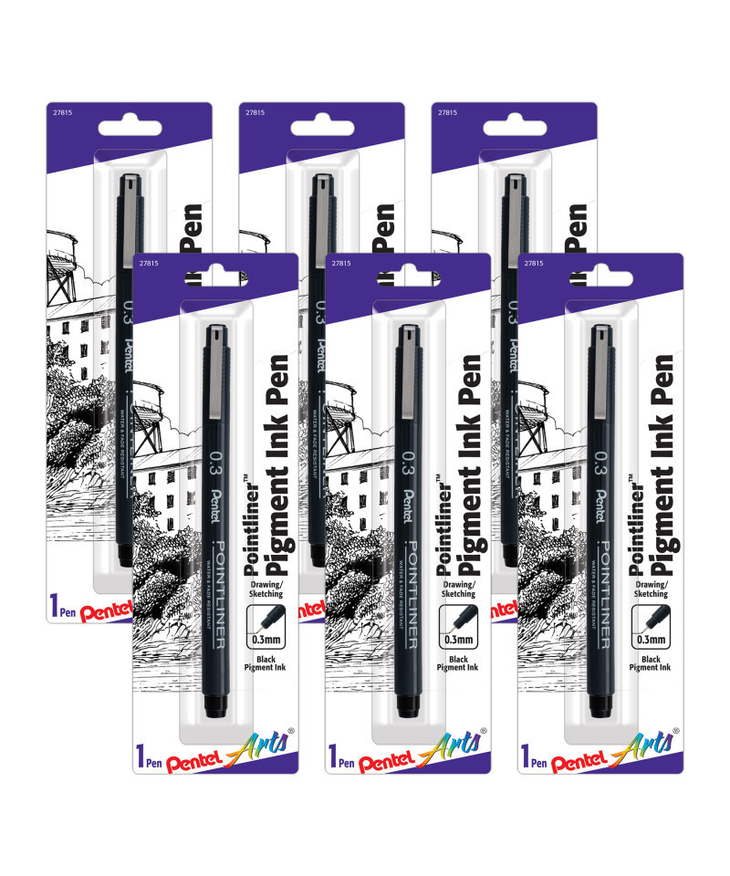 The Pointliner lines draw clean, in a rich solid black pigment ink. The durable plastic nib does not degrade or split over time like competitive brands. The ink flow is consistent is perfect for shading techniques, such as cross hatching and stippling. The waterproof ink dries quickly and integrates well with watercolor washes. Sold as a pack of 6.