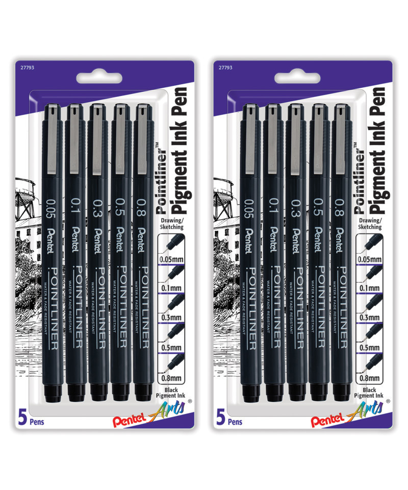 The Pointliner lines draw clean, in a rich solid black pigment ink. The durable plastic nib does not degrade or split over time like competitive brands. The ink flow is consistent is perfect for shading techniques, such as cross hatching and stippling. The waterproof ink dries quickly and integrates well with watercolor washes. Each set includes 5 pens in 5 line sizes: 0.05mm, 0.1mm, 0.3mm, 0.5mm, and 0.8mm. Sold as 2 sets for a total of 10 pens.
