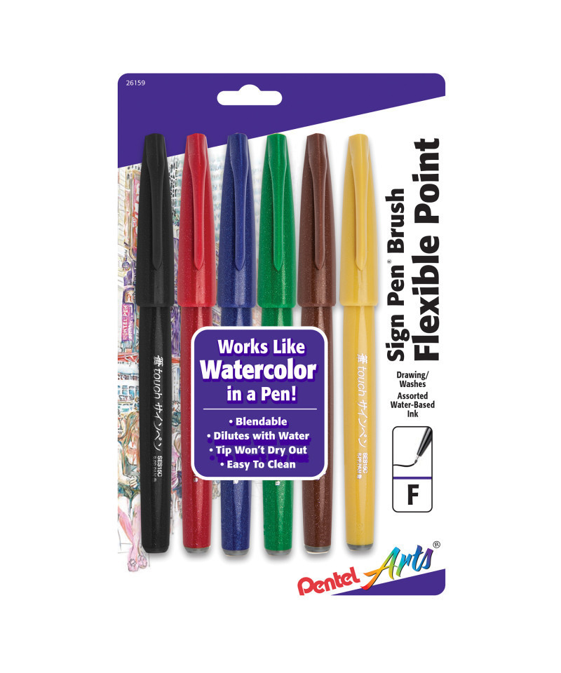 Pentel Arts Sign Pen Brush Tip, Assorted Colors, 6-Pack