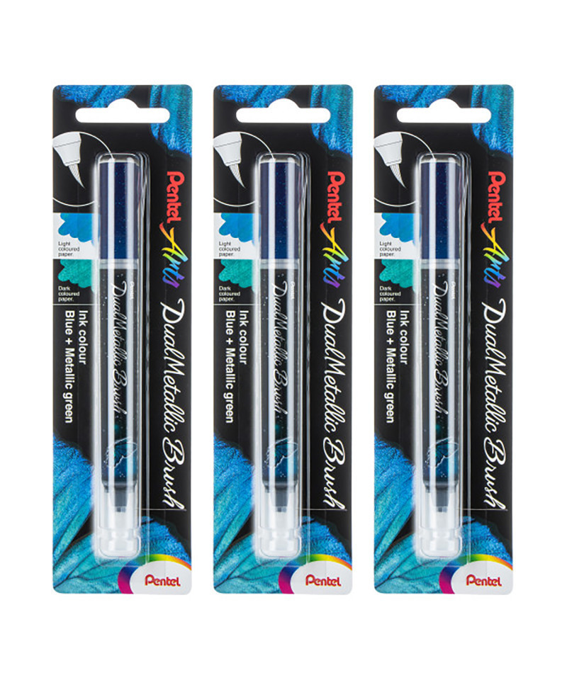 Pentel Arts DualMetallic Brush, Blue/Metallic Green Ink, Pack of 3