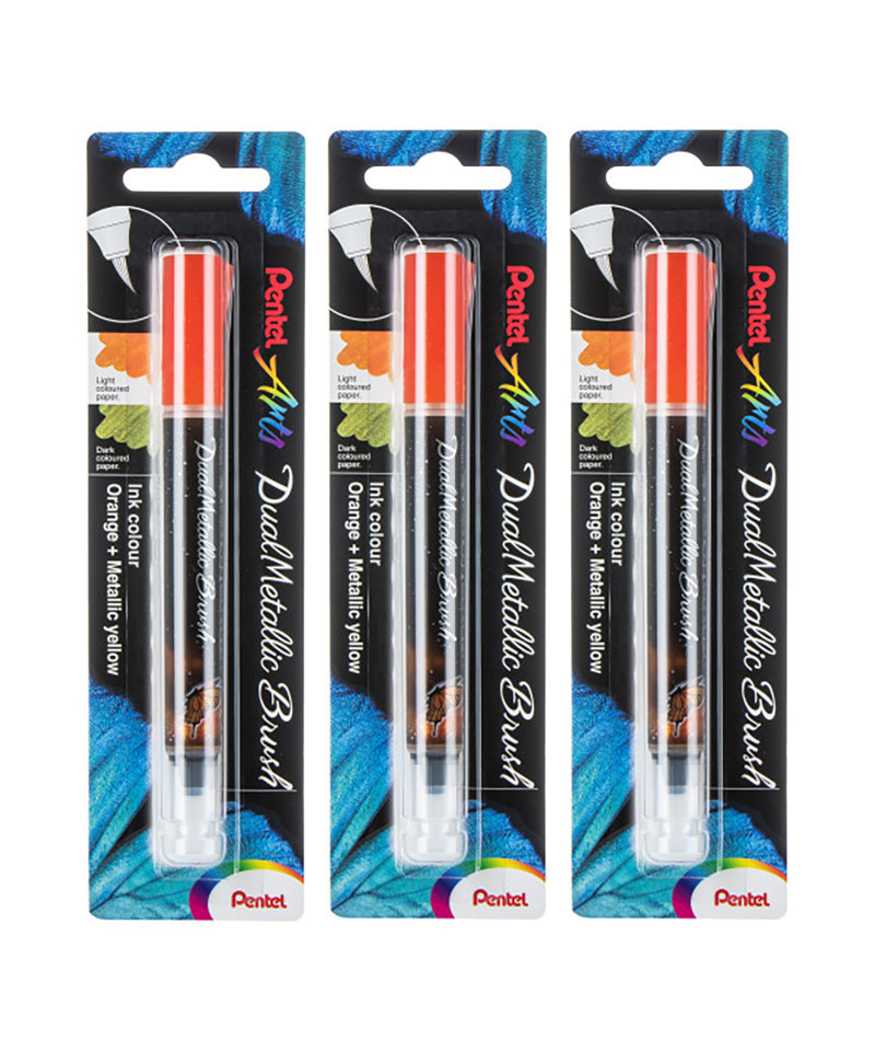Pentel Arts DualMetallic Brush, Orange/Metallic Yellow Ink, Pack of 3