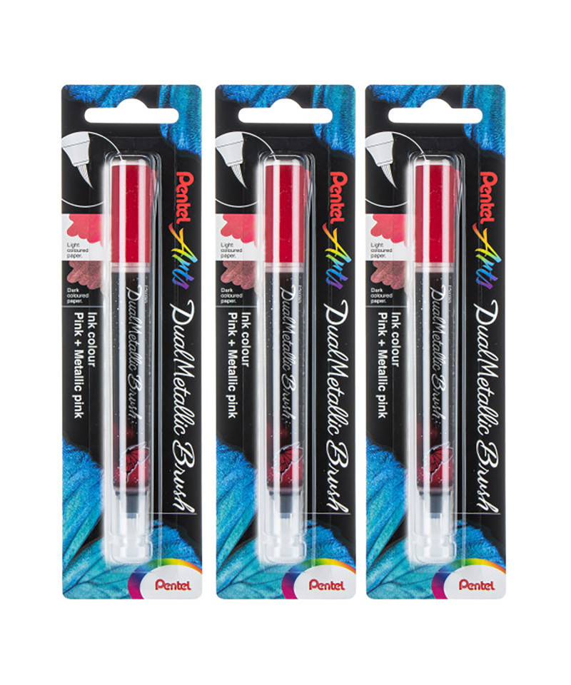 Pentel Arts DualMetallic Brush, Pink/Metallic Pink Ink, Pack of 3
